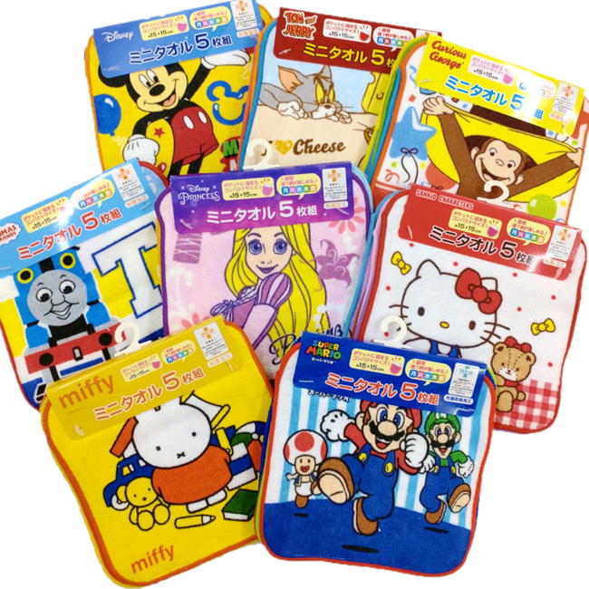 キャラクターミニタオル 5枚組 セット ミニタオルハンカチ ポケットに収まる コンパクトサイズ プチタオル 抗菌防臭加工 丸眞