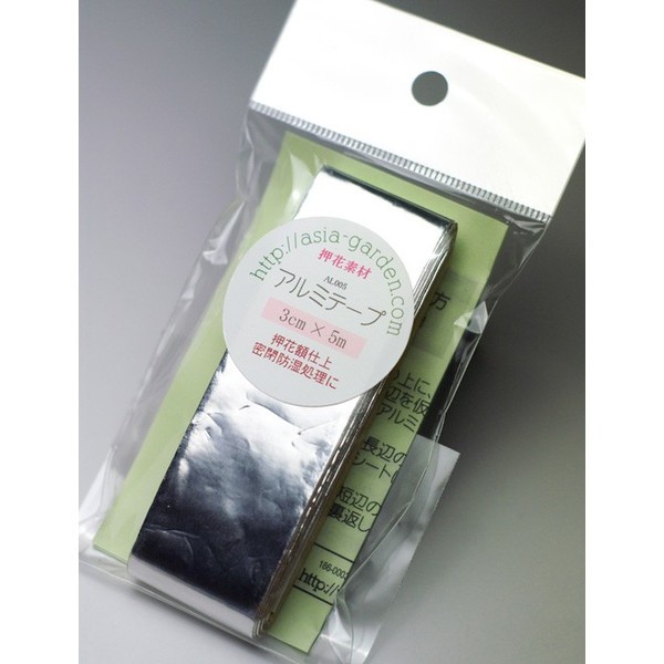 | 額装の仕方 |  アルミシートは台紙と同じ大きさに切り、中央に一回り小さな乾燥剤をのせます。 |  裏返してヘラで良く密着させます。 |  アルミテープを台紙の長編より少し短く切り、折り返して固定します。 |  台紙の短編の二倍くらいに2本切り、角を包むように重ねて仕上げます。 | | |  | | ●押し花額裏処理用のり付アルミテープ。ガラスの周囲仕上げに使い、湿気から大事な押し花を守ります。お好みのサイズに切ってお使い下さい。 | | サイズ | 幅3cm×5M | | お勧めポイント | ●使いやすい5Mサイズ。 まずはおためし下さい。 | | | 関連商品 | | へら | 適度な硬度をもった使いやすいプラスティック製のへらです。 | | アルミシート | 押し花額の防湿処理用。信頼の80ミクロン (50cm×100cm) | アルミテープ (50M巻) | 押し花額の防湿処理用。周囲に使います 巾3cm×50M |  表側からもしっかりヘラをかけ、 圧着してしわを伸ばします。 全部出来たら額に入れて完成です。 |