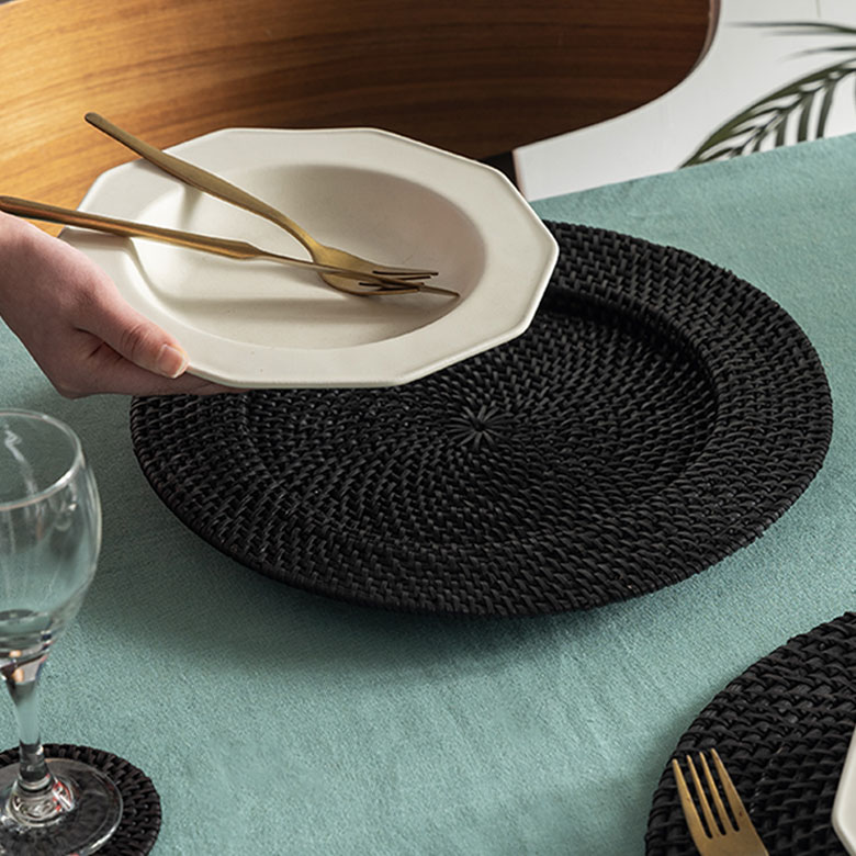 洗練されたテーブルコーディネートを作る、エスプレッソブラックカラーのラタンアイテム。
