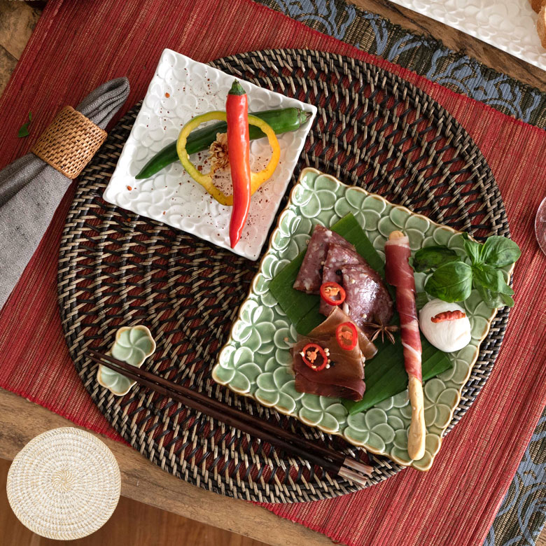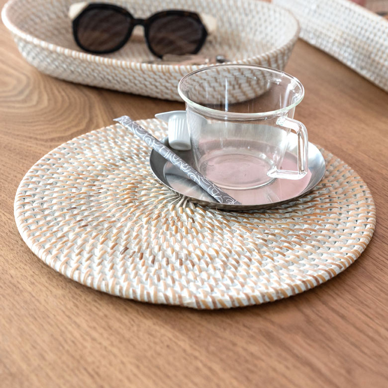 ラタンのプレートトレイ | ラタンの透かし編みランチョンマット | ランチョンマット ホワイトウォッシュ |