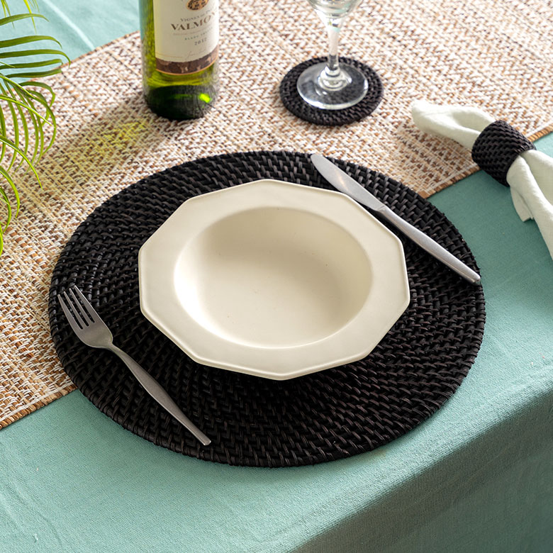 洗練されたテーブルコーディネートを作る、エスプレッソブラックカラーのラタンアイテム。
