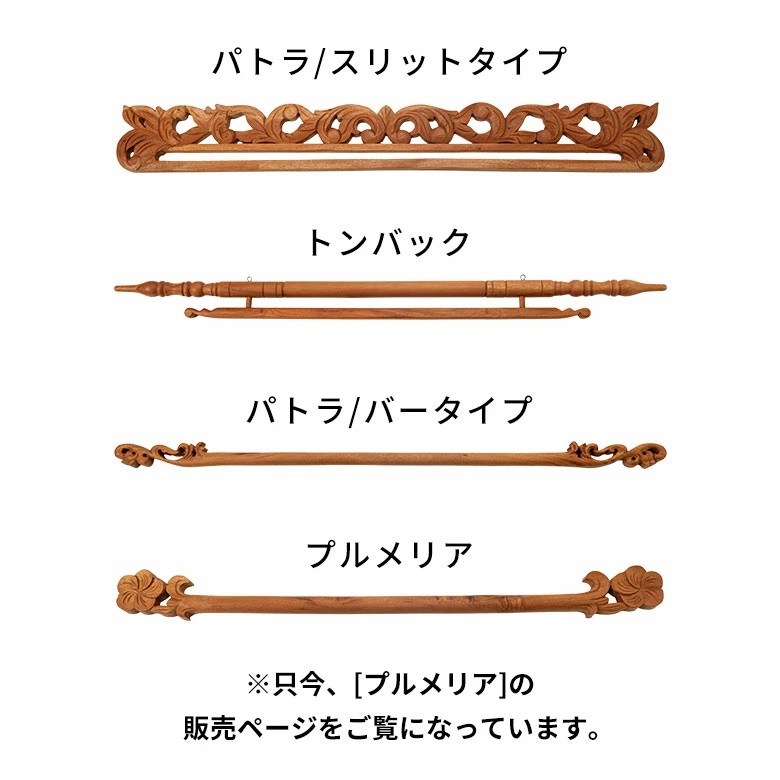 両端にあしらわれた立体的なプルメリアの花の彫刻が、自然素材の温もりを感じる、やさしく落ち着いたアクセントを演出します。