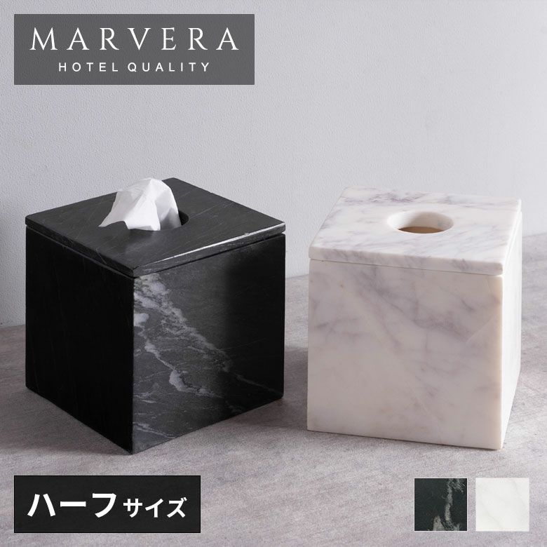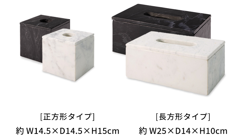内寸は12×12×13cmで、ハーフサイズのソフトパックティッシュがぴったり収まります。一般的なティッシュを二つにカットしてお使いいただくのもおすすめです。重厚感と高級感があり、ホテルライクでモダンなお部屋に格上げしてくれるインテリアアイテム。カラーはブラック・ホワイトの2色展開で用途やインテリアに合わせてお選びいただけます。