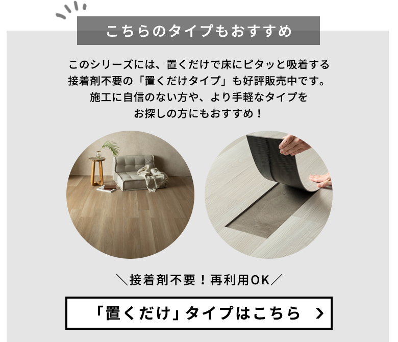施工方法はこちらのシリーズ最安値「ドライバックタイプ」だけでなく、置くだけでピタッと吸着する接着剤不要の