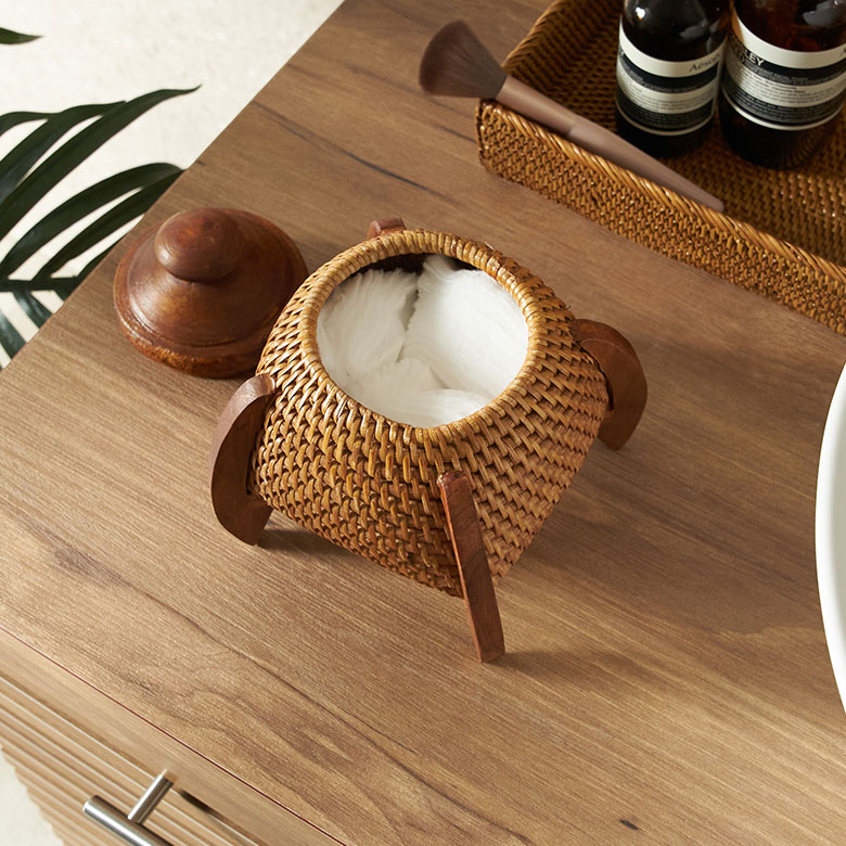 アメニティや小物の収納・ディスプレイとしても活躍。ナチュラル素材ならではの風合いが、南国ムードやリゾート感のある空間づくりにおすすめです。