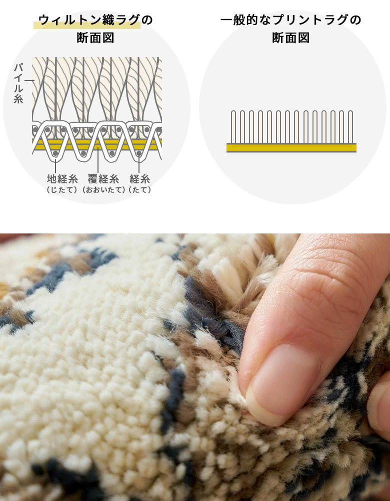 ・パイルの密度が非常に高く、抜け毛が出にくいウィルトン織