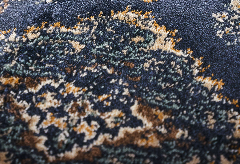ウィルトン織ラグとプリントラグ。その違いは一目瞭然!安価なプリントラグは、毛先にのみ模様をプリントしているため、毛足が寝たり摩耗したりすると、柄がかすれて薄くなることがあります。一方、ウィルトン織ラグは、色付きのパイル糸を組み合わせて模様を作るため、発色が美しく色褪せにくいのが特徴です。さらに、光の当たり方や見る角度によって陰影が生まれ、立体感のある美しいデザインを楽しめます。
