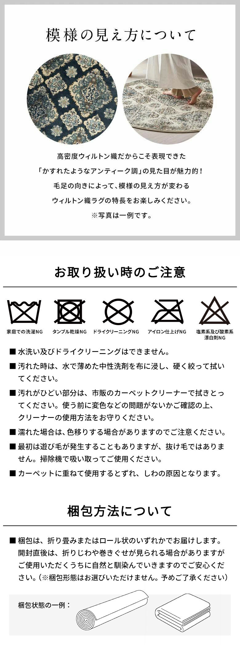 ウィルトン織は、18世紀のイギリス・ウィルトン地方で生まれた伝統的な織り技術。ヨーロッパでは土足で使われることが多く、ウィルトン織ラグはその高い耐久性で 広く普及しました。丈夫なつくりで、使い続けても美しい状態をキープできるので、長年愛用できます。さらに、底つき感のないクッション性と、高密度に織り込まれたパイルにより、毛足が倒れにくく摩耗に強いのも特徴です。