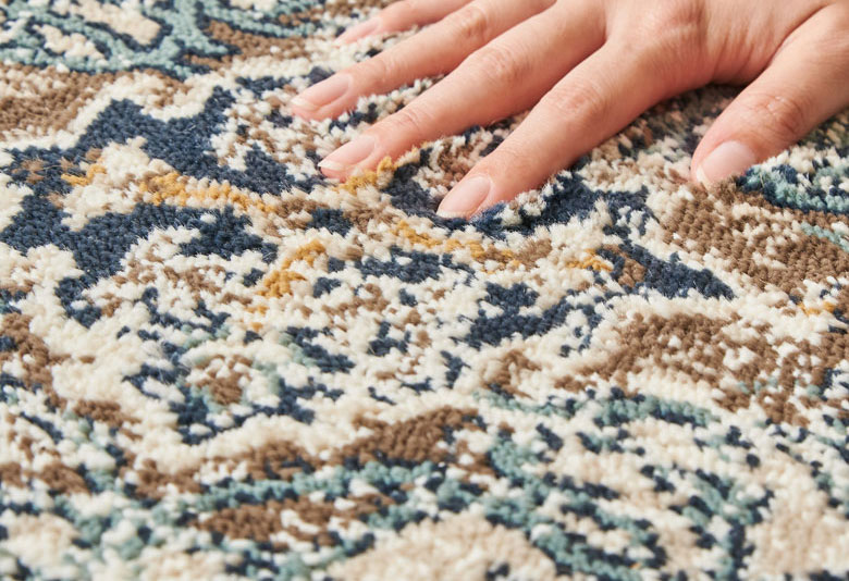 このラグは、パイル糸を複数の糸で交差するようにしっかりと織り込まれているため、プリントラグやシャギーラグ、マイクロファイバーラグに比べて、遊び毛や抜け毛がないのが特徴。また、毛足の密度が高くゴミやホコリが奥に入りにくいため、日々のお手入れは掃除機をかけるだけで清潔を保つことができます。