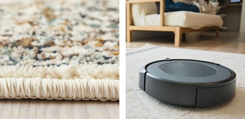 | オーバーロック加工 高級感のあるオーバーロック加工でしっかりと縫い上げられており、端がほつれてくるのを防いでくれます。 | ロボット掃除機対応 厚みは約1cmと薄く、ロボット掃除機も乗り越えることができます。 |