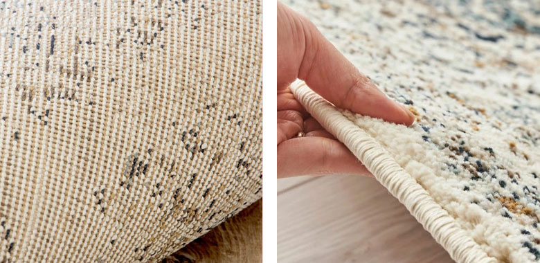 ウィルトン織ラグとプリントラグ。その違いは一目瞭然!安価なプリントラグは、毛先にのみ模様をプリントしているため、毛足が寝たり摩耗したりすると、柄がかすれて薄くなることがあります。一方、ウィルトン織ラグは、色付きのパイル糸を組み合わせて模様を作るため、発色が美しく色褪せにくいのが特徴です。さらに、光の当たり方や見る角度によって陰影が生まれ、立体感のある美しいデザインを楽しめます。