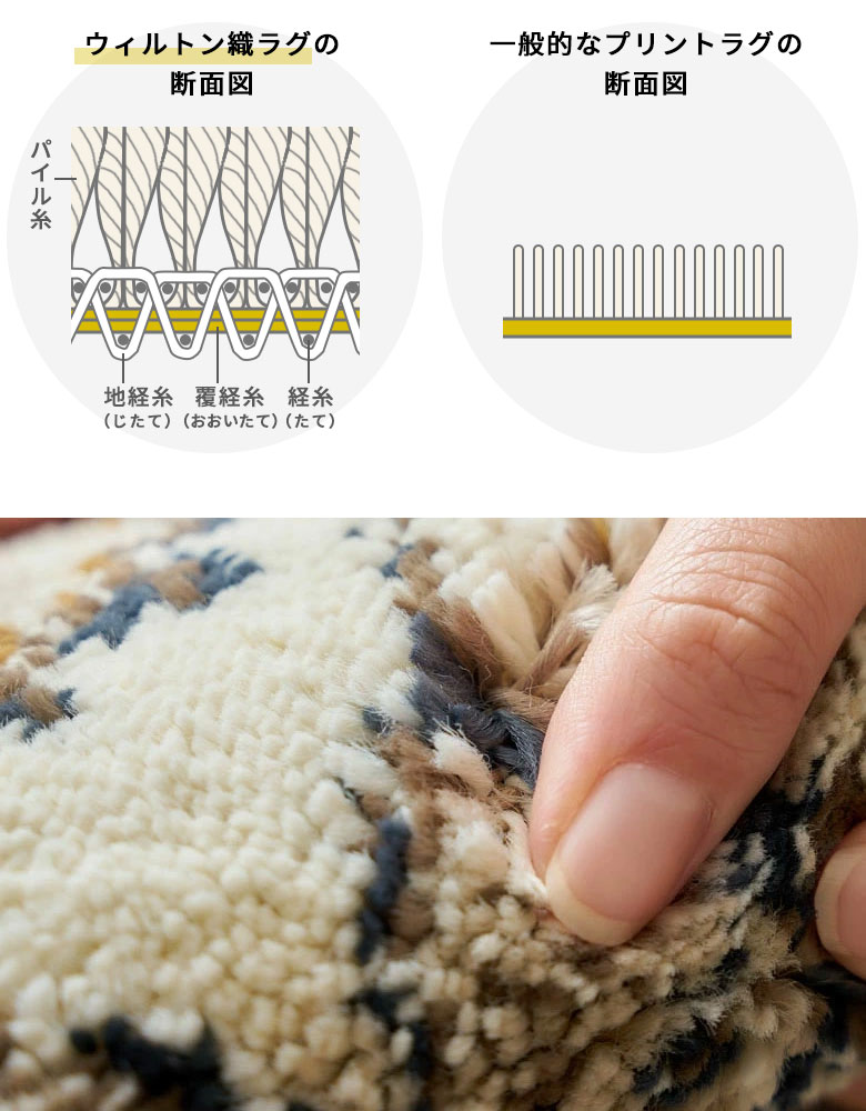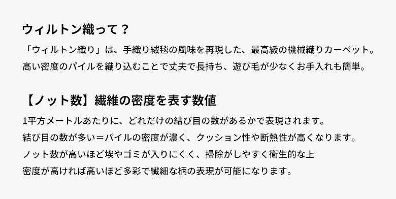 ・パイルの密度が非常に高く、抜け毛が出にくいウィルトン織