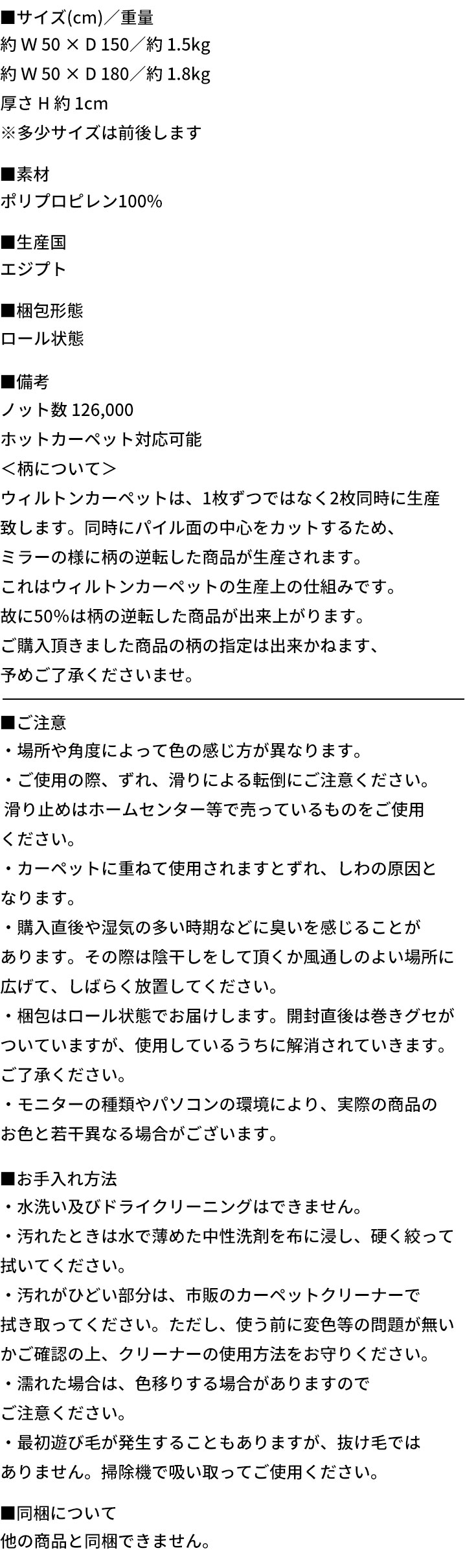 ・密度は普及品クラスの126,000ノット。ギュッと目が詰まっており、ゴミが入りにくく、お手入れも簡単