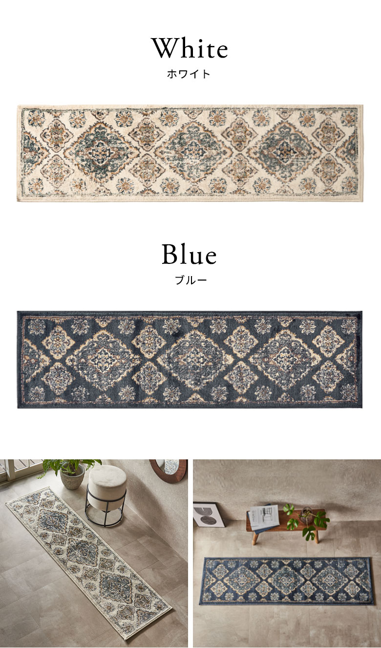 約50×180cmの一般的なキッチンマットサイズ。キッチンはもちろん、廊下やベッドサイドにもおすすめで、自由なコーディネートをお楽しみいただけます。 アラベスク柄の主張しすぎない“擦れ感”が、この商品ならではの魅力。 一枚敷くだけで空間の印象が変わる憧れのペルシャ絨毯風デザインです。
