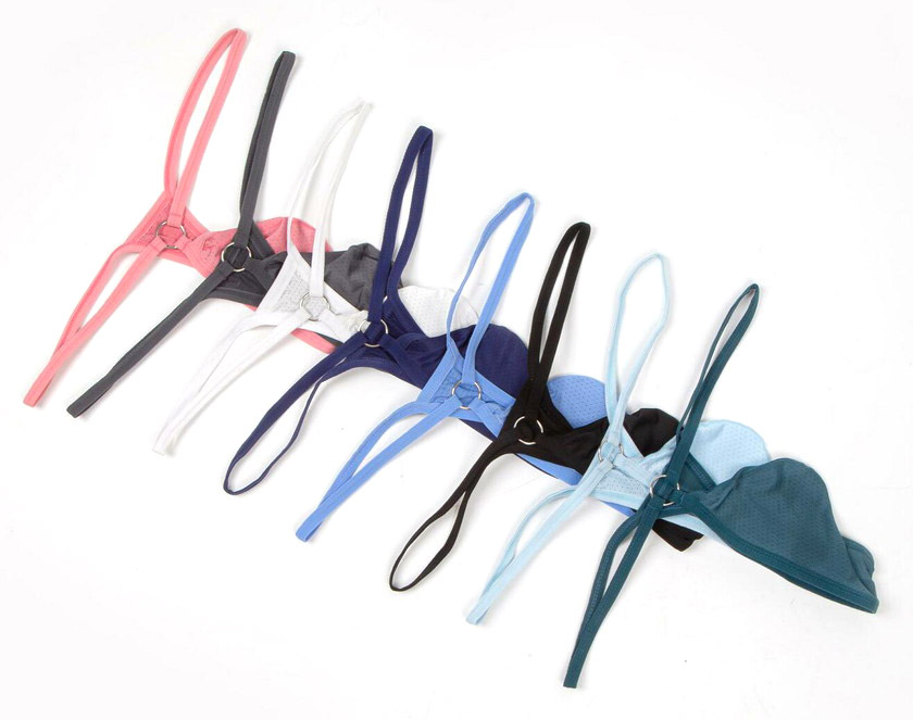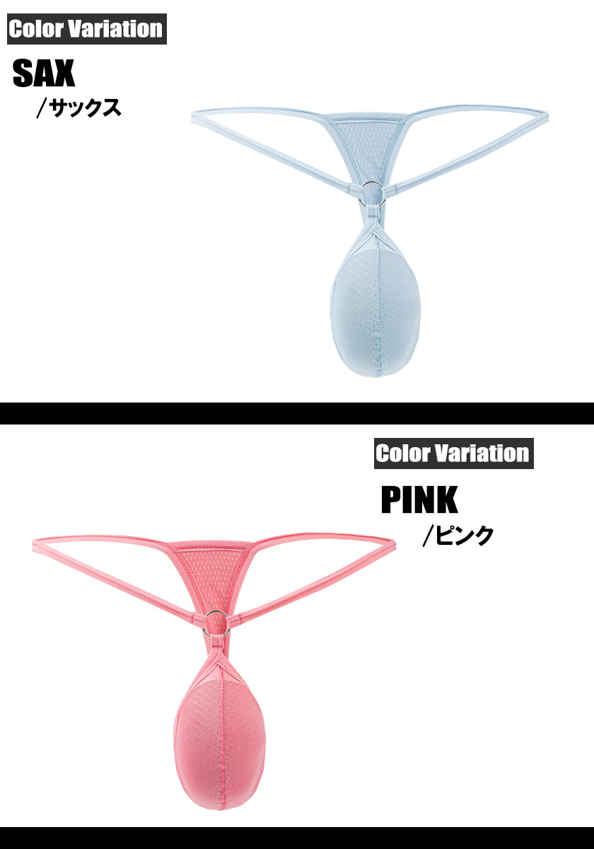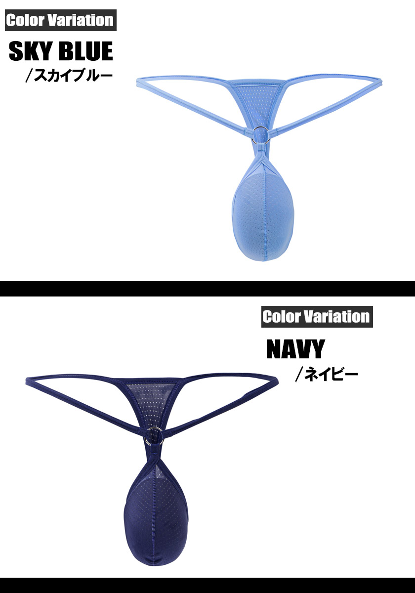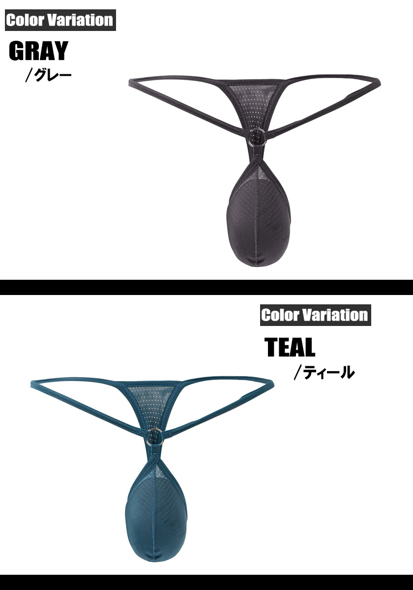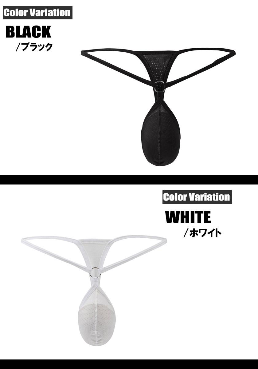 等間隔に丸い穴の空いたメッシュ生地を使用しており、穴越しに肌が見えるセクシーな演出と、通気性が良く開放的な着用感を生み出します。細いウエスト紐と、フロント中央で輝くメタルリングがデザインのアクセントになっています。