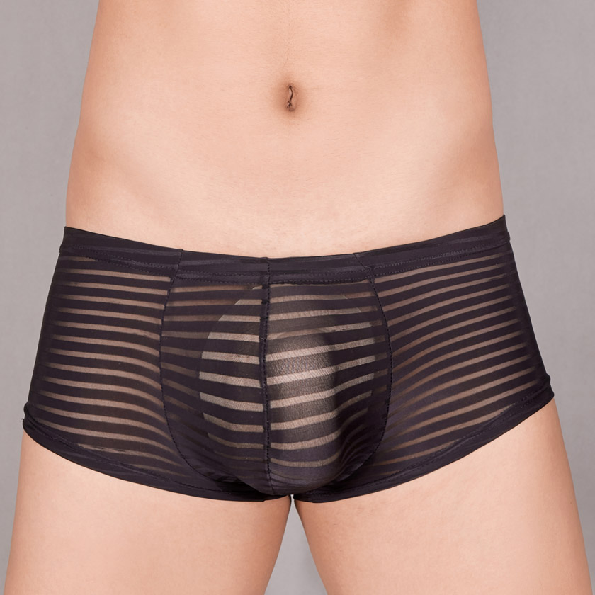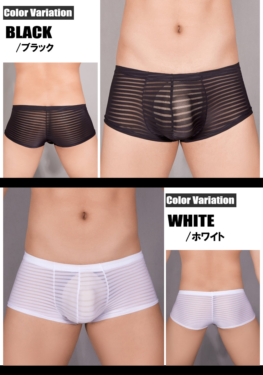 ■商品説明:ボーダー柄の合間から肌が透けるセクシーなボクサーパンツです。フロントが立体的に縫製されており、男性自身の収まりが良く、ボリューム感のある外観になります。同じ生地を使用した縦縞のタンクトップを商品番号:deep-3070にて販売しております。上下を揃えたコーディネイトもおすすめです。