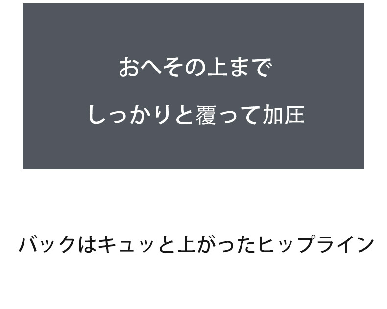 おへその上までしっかりと覆って加圧。お腹まわりの余分なラインが抑えられて、スッキリとしたボディラインに。バックはキュッと上がったヒップライン。太ももにもしっかり加圧してシェイプアップします。