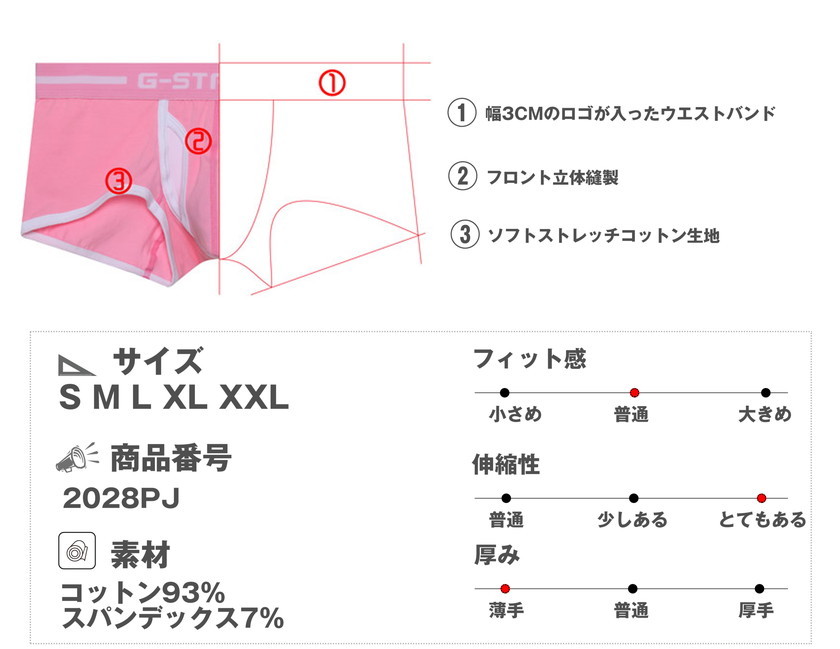 フロント部分は立体縫製し、圧迫感なく、余裕をもって男性自身を収められます。また、自然なボリューム感のアウトラインは、男性的なセクシーな外観を作り上げます。フロントのみ二重生地です。前開き付きでとっても便利です。