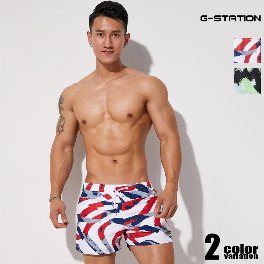 軽量で耐久・耐水性があり乾きの早いポリエステル素材のサーフパンツ型スイムウェア。不規則にラインを引いた存在感のある柄です。