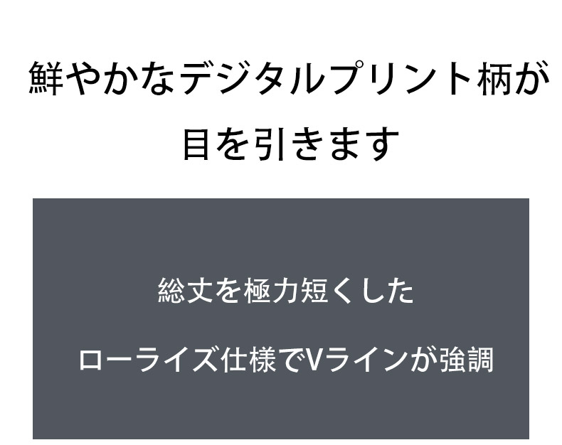 鮮やかなデジタルプリント柄が目を引くショートボクサーパンツです。総丈を極力短くしたローライズ仕様でVラインが強調されます。優れた伸縮性の極薄生地が、ボディをふんわりと包み込みます。