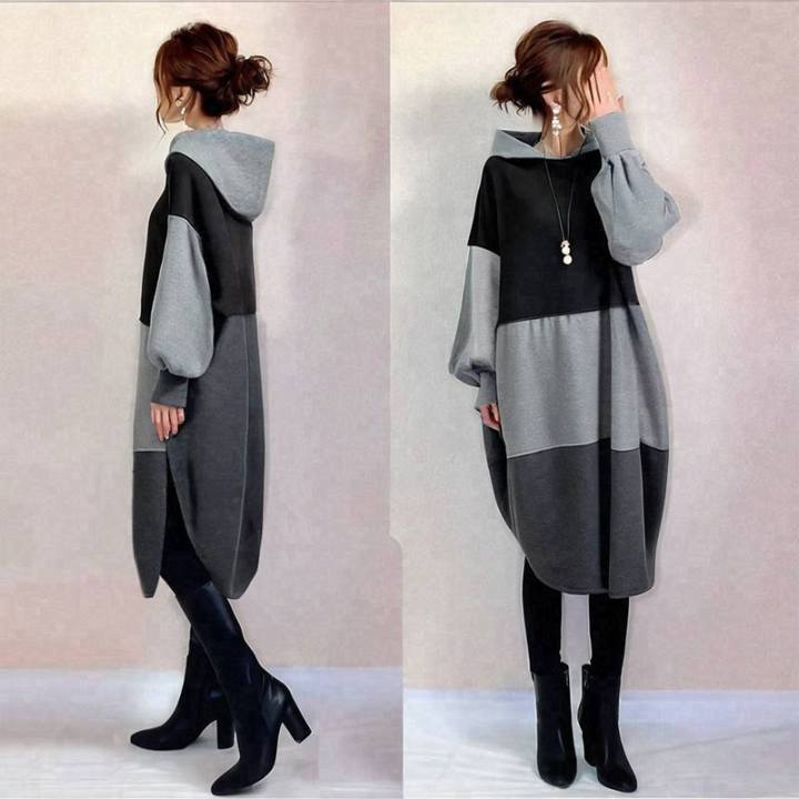 ワンピース 秋 長袖 フード付きワンピース バイカラー スリット パフスリーブ 大人可愛い 体型カバー きれいめ 膝下丈 春秋ワンピ ゆったり オフィスカジュアル