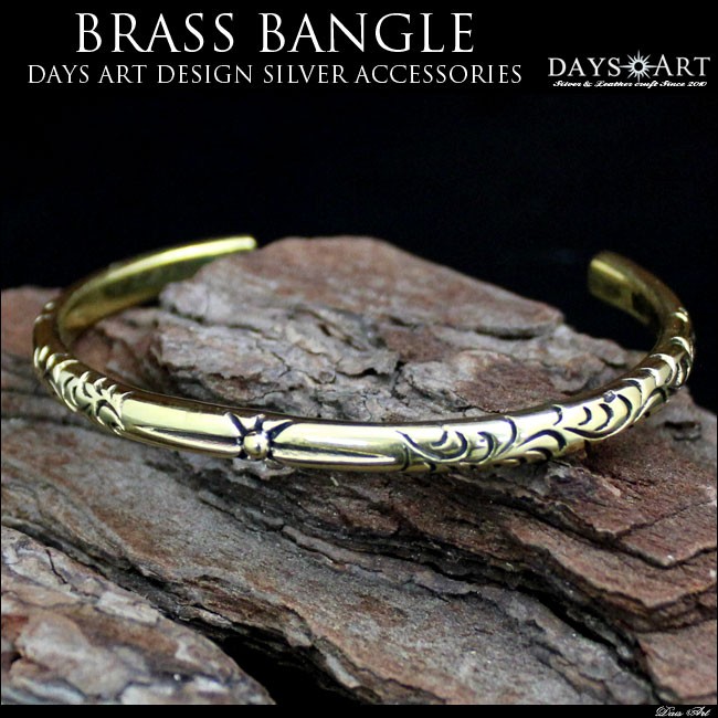 トップには太陽神、サイドにはアラベスクの彫刻が施されており、シンプルでさりげないオシャレにぴったりです。他のブラスレットとの重ね着けにもオススメです。