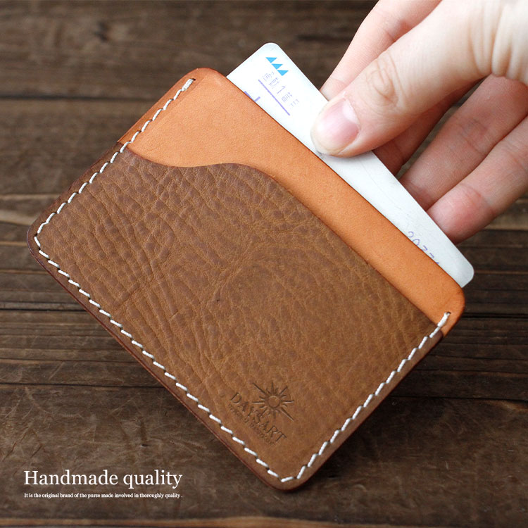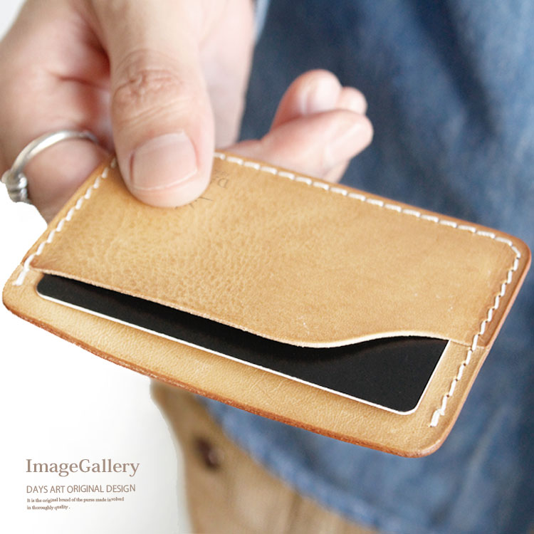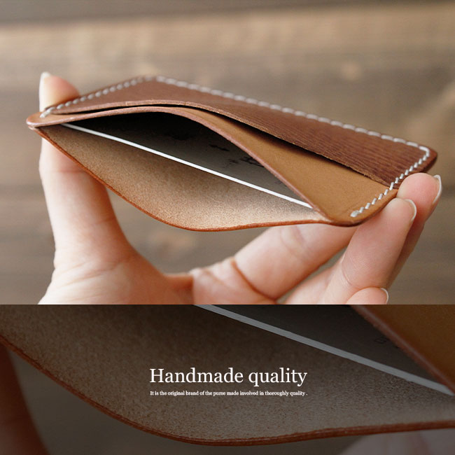 本革を使用してハンドメイドで製作したカードケースです。シンプルなデザインに角丸シルエットが優しい印象を与えます。ベジタブルタンニン鞣しのイタリアンレザーを使用しており、エイジング加工を施してあるため、味わい深い風合いがたまりません。定期や免許証などを入れておくのに丁度いいカードケースです。