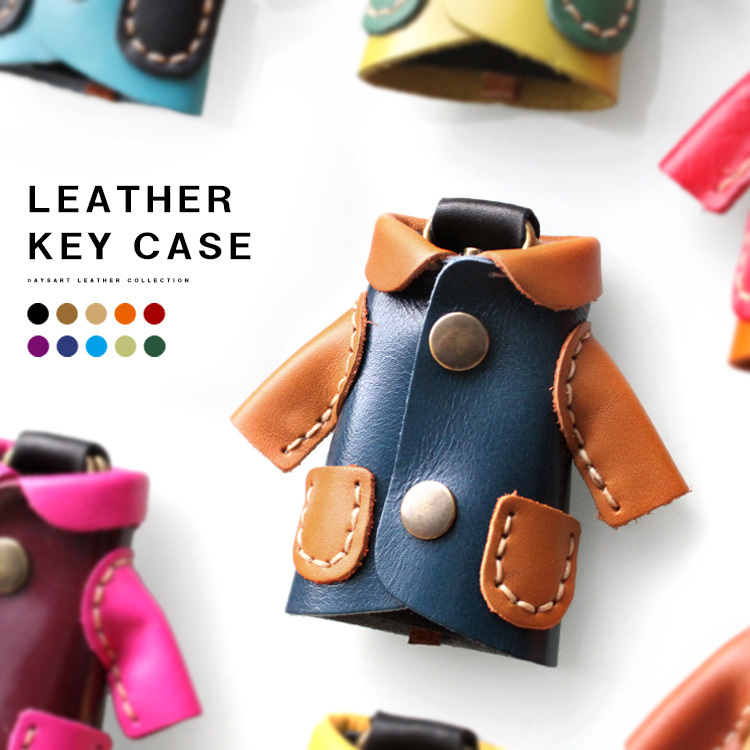 本革をワックスコードで縫い合わせたハンドメイド製キーケースです。とても滑らかでさらさらとした手触りに革の表情が楽しめます。コートをモチーフにしたユニークで可愛らしいデザインが特徴です。