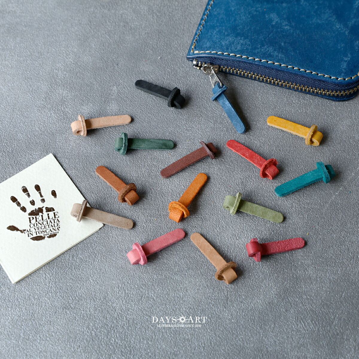 上質なイタリアンレザーで仕上げた、4個セットの本革ファスナー引き手。DAYSARTのマヤレザー製バッグや財布と相性抜群で、セット使いやカスタマイズに最適です。壊れたジッパーの補修はもちろん、こだわりのレザーアイテムとしての仕上げにもおすすめ。