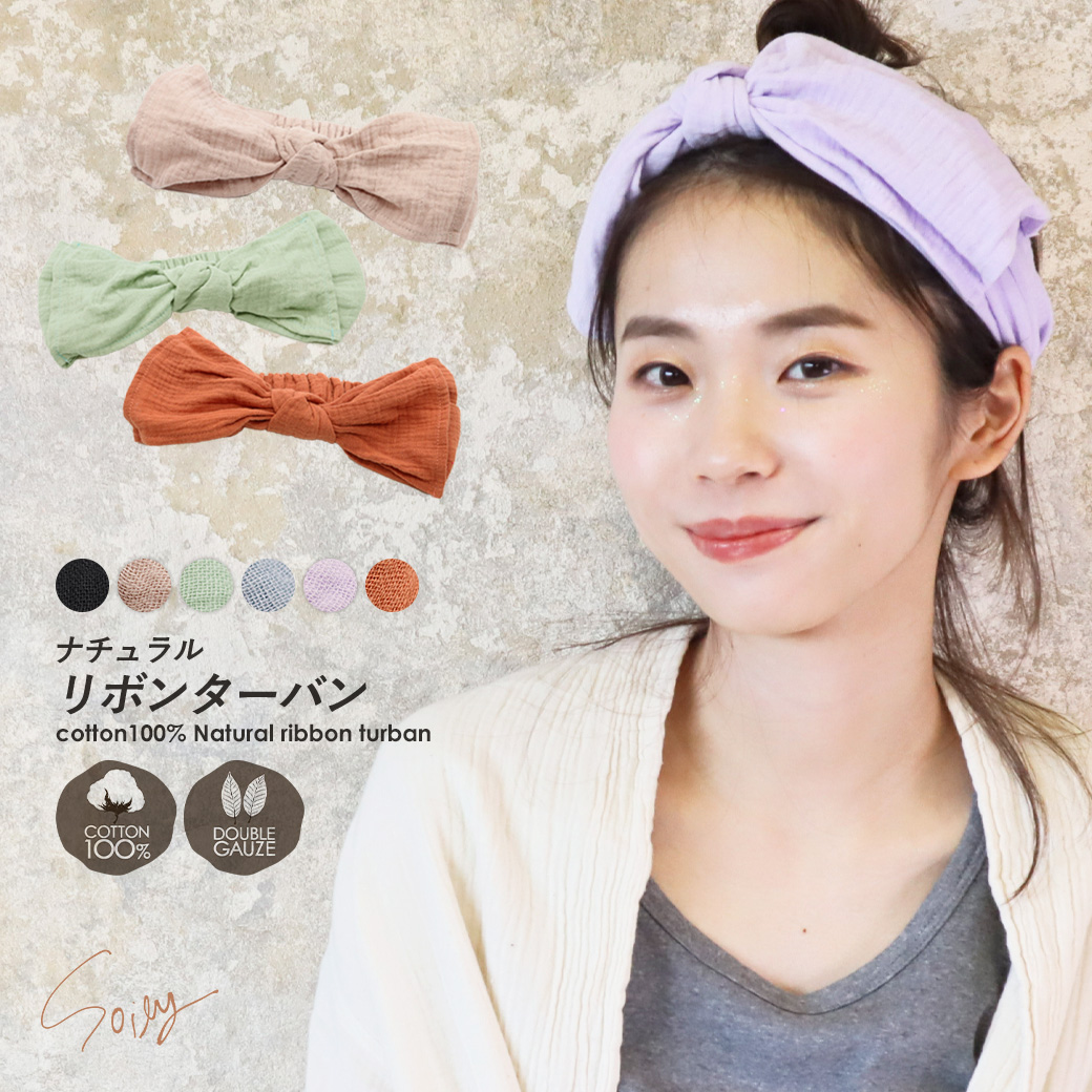 ダブルガーゼ リボンヘアターバン ヘアバンド 綿100% 背面ゴム 大人 ナチュラル コットンガーゼ 無地 大人可愛い ヘアアクセサリー プレゼント *2-3t *y3-6t
