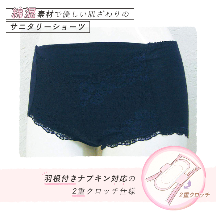 サニタリーショーツ 深履き 羽つきナプキン対応 綿混 生理用ショーツ 大きいサイズ M L LL 下着 シンプル レース 無地 ハイウエスト 尿漏れ *y3-4t●