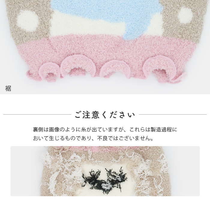 ・生地の特性上、生産過程において糸の継ぎ目や多少のほつれ、ループなどが生じている場合がございますが、品質上の問題ではございません。