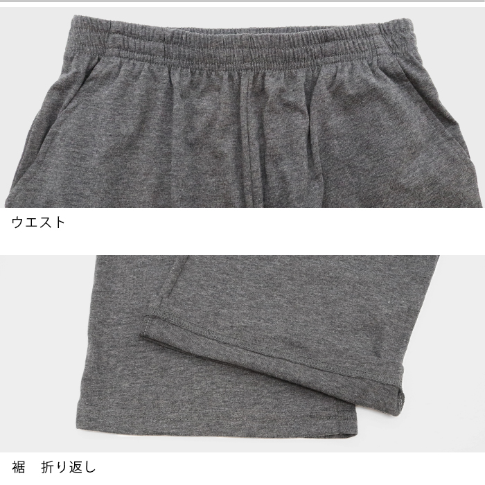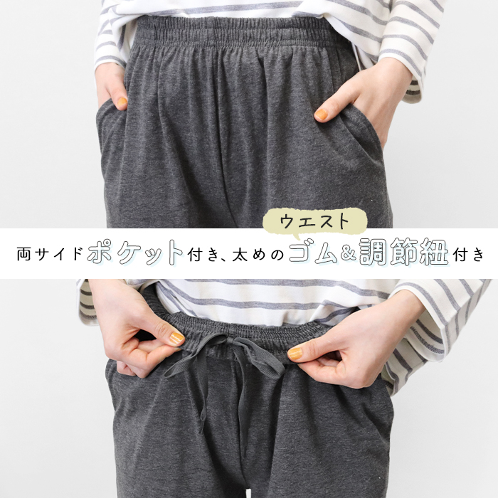 両サイドポケット付き、ウエストは太めのゴム&調節紐付き。