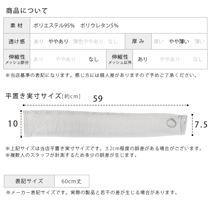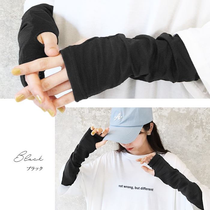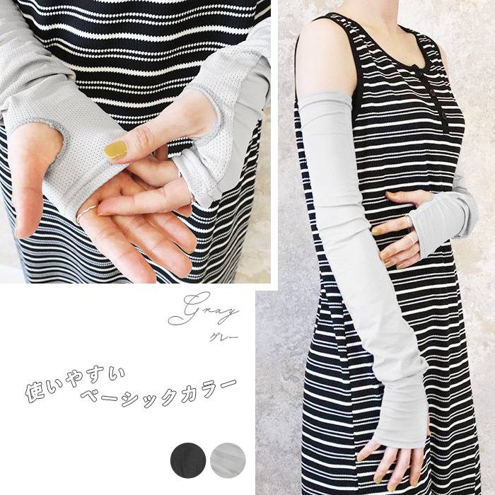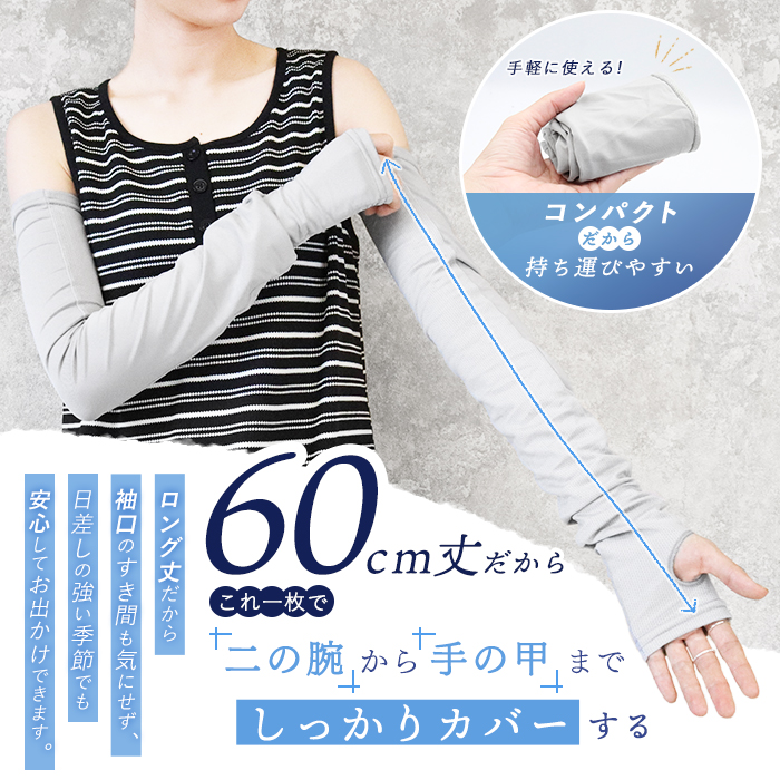 うれしい60cmのロング丈だから、コレ1枚で手の甲から二の腕までしっかりカバー。