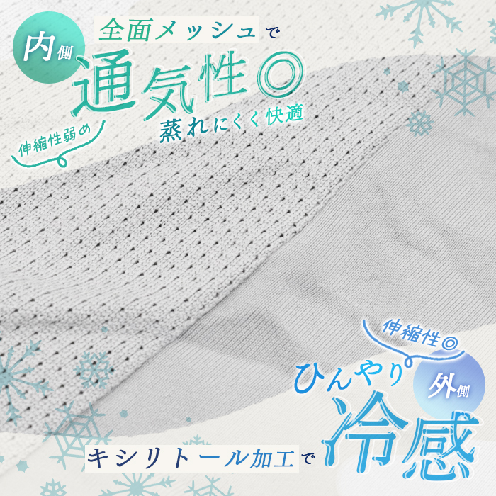 外側はひんやり感じるキシリトール加工、内側は全面メッシュで蒸れにくく快適!