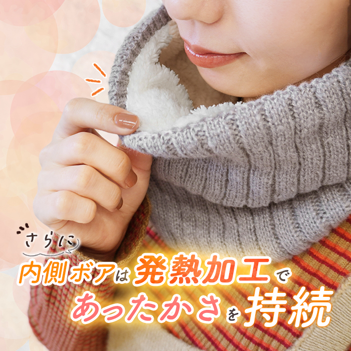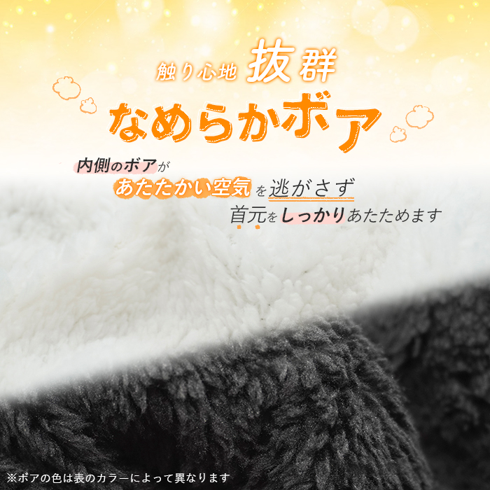 触り心地抜群のボア生地があたたかい空気を逃がさず首元をしっかりあたためます。