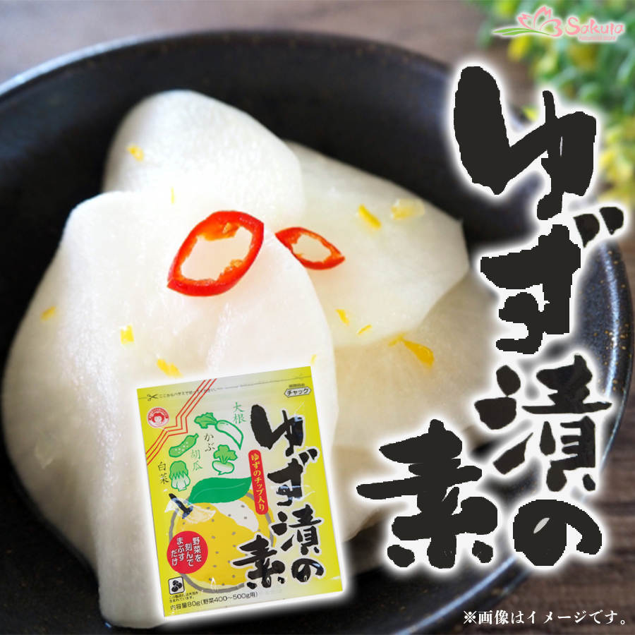 ゆず漬の素80gゆずチップ入り野菜を刻んでまぶすだけ粉末タイプで1袋に対して400〜500g分のお野菜を漬けることができます。