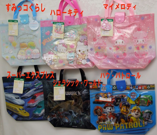 サンリオビーチバッグ、パケット舟形、すみっコぐらし、ハローキティ、マィメロディ、スーパーエクスプレス、ジュラシックワールド、ハウ・パトロール6柄