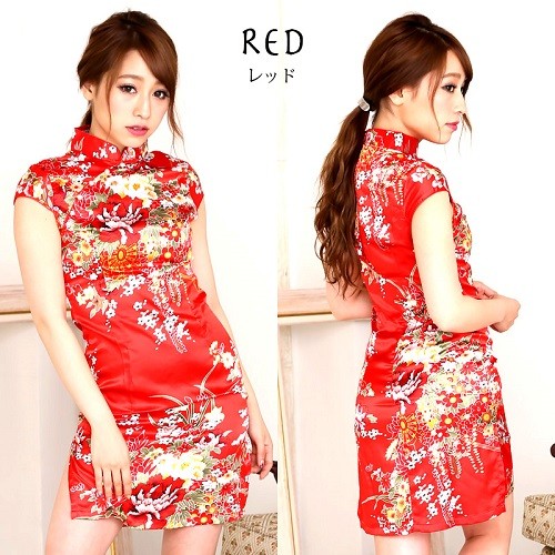 チャイナ服 花柄半袖ミニ丈 レッド(M-L・L-LLサイズ) 襟元と品のあるパールボタンデザイン、脚を美しく魅せるサイドスリットで優雅な魅力