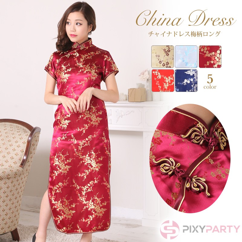 チャイナドレス 梅柄のロングタイプ半袖 優雅な魅力のシルエット、イベントパーテイにドレスコードでも 選べるM〜5L 人気なお洒落