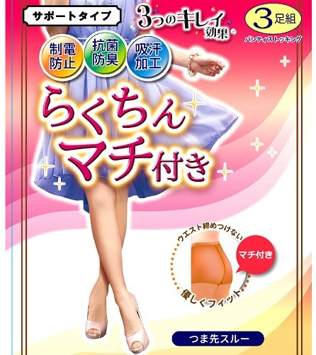 楽ちんマチ付き サポートタイプパンスト (3足組) 静電防止・抗菌防臭・吸汗加工でウエスト締め付けない、マチ付きで優しくフィット、つま先スルー