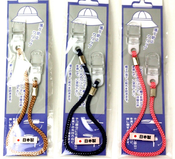 帽子落下クリップ 日本製 ひも長さ29cm 帽子と洋服の衿に挟んで、風の日など帽子の落下と紛失を防ぎます
