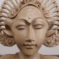 クロコダイルウッドに手彫りで繊細に彫刻された木彫りの置物です。ジャンゲールダンスとはバリ島で男女のペアが歌いながら踊るダンスでその女性の踊り子の顔を彫刻したオブジェです。 写真が現物になります。