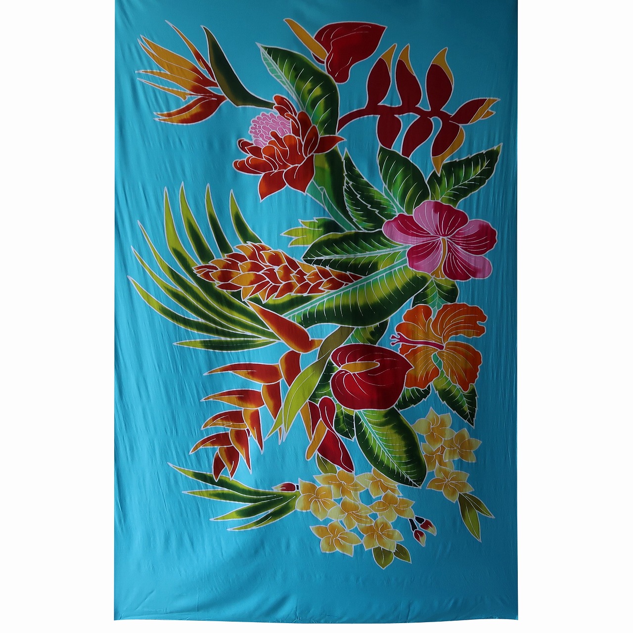 ろうけつ染め 腰巻き布 壁掛け 布生地 テーブルクロス シートカバー 更紗 サラサ フラダンス衣装 アジアン雑貨 バリ雑貨 ハワイアン雑貨 リゾート テイアレ ビーチ水着青色 ハイビスカス アンセリューム ストレリチア べゴニア プルメリア パームリーフ
