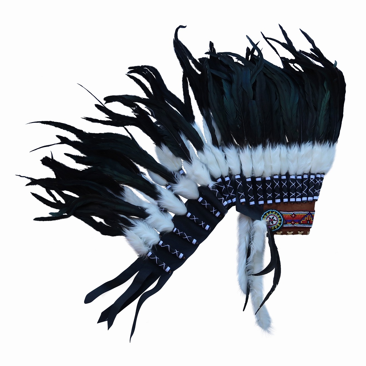 ホンモノの鳥の羽で作ったインディアンハットです。これがあればインディアン気分が味わえます。 本品はアメリカにも輸出している工房で作られています。 羽は染めているのではなく天然の羽の色になります。羽の色は真っ黒ではなくやや緑色が入っています。