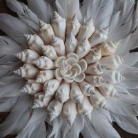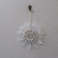 白い羽と白い貝で作ったBohoスタイルのエキゾチックな雰囲気のレリーフです。軽いので押しピンでも壁につけれます。