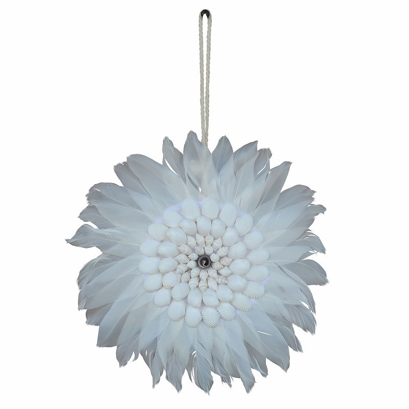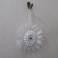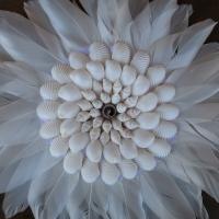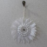 白い羽と白い貝で作ったBohoスタイルのエキゾチックな雰囲気のレリーフです。軽いので押しピンでも壁につけれます。