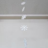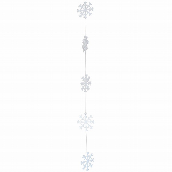 窓際のデコレーションにオススメな木の粉を固めたMDFにペイントした雪の結晶が5つぶら下がっています。天井や窓に吊り下げて飾ってください。