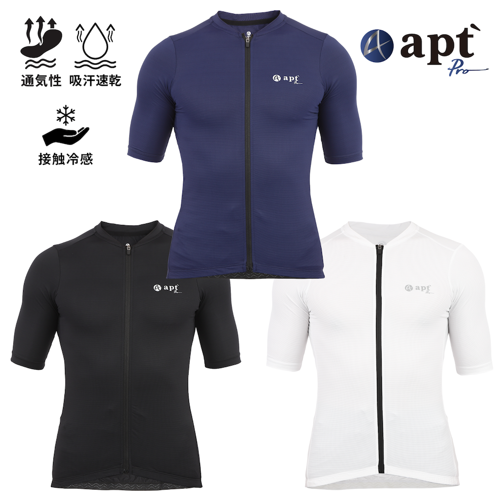 apt’PRO サイクルジャージ 半袖 メンズ。接触冷感×吸汗速乾×高通気で真夏のライドもドライに。高弾性ストレッチが身体に美しく沿い、上質なフィット感と快適性を両立。フロントはフルジップで温度調整が容易。背面3ポケット+ファスナー付き1でスマホ・補給食・工具・鍵を賢く仕分け。裾すべり止めが前傾やダンシング時のズレを抑制。反射トリムで夕暮れ〜夜間の被視認性を確保。ロードバイク/自転車通勤/ロングライドに最適。春夏の定番、自転車ウェア。NAVY・BLACK・WHITE/S?XL、apt’PRO公式。