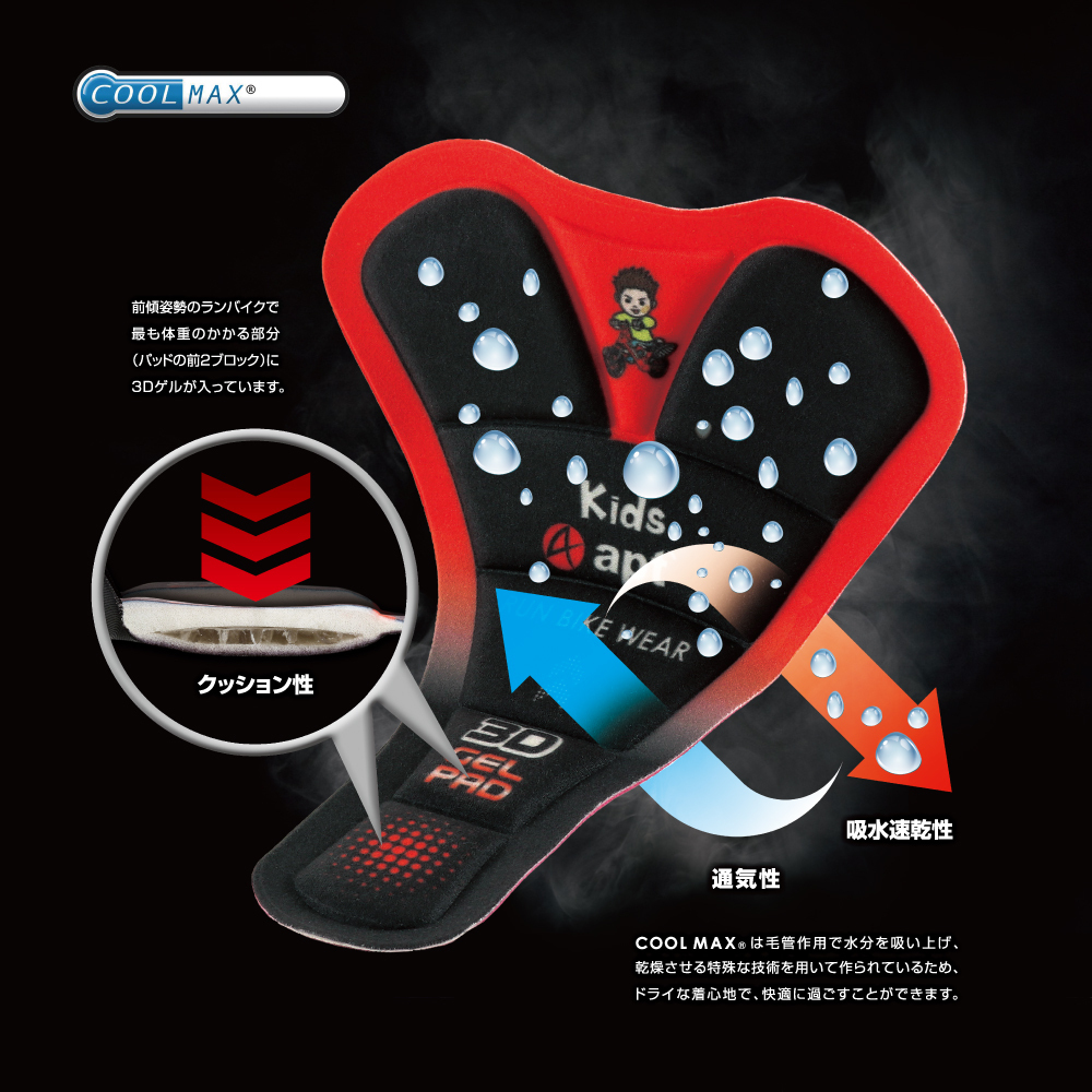 長時間の練習やなどで、股間部分に掛かる負荷を軽減し、お子様の健やかな成長をサポートします。